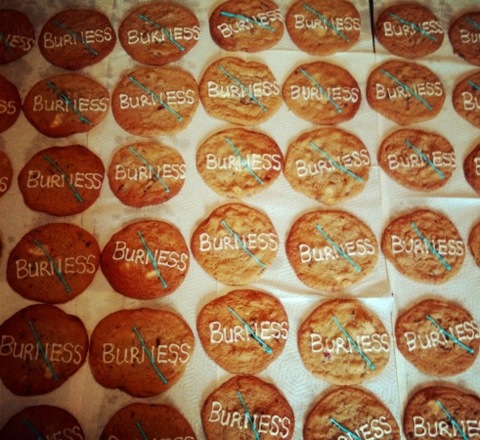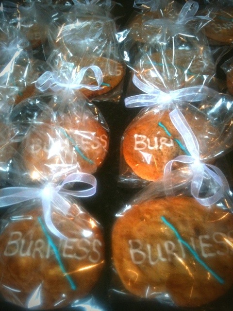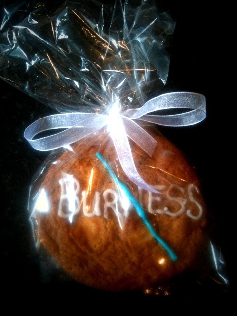 I made large triple chocolate & cherry chewy cookies and piped the Burness logo onto each one, before individually packing them in cellophane bags tied with a pretty white ribbon.