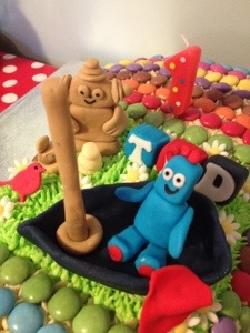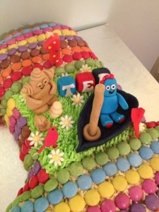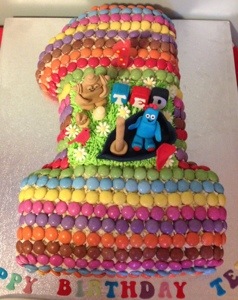 My little boys first birthday cake, incorporating a little bit of “in the night garden” and lots of smarties! He loved his first proper piece of cake 🙂 x