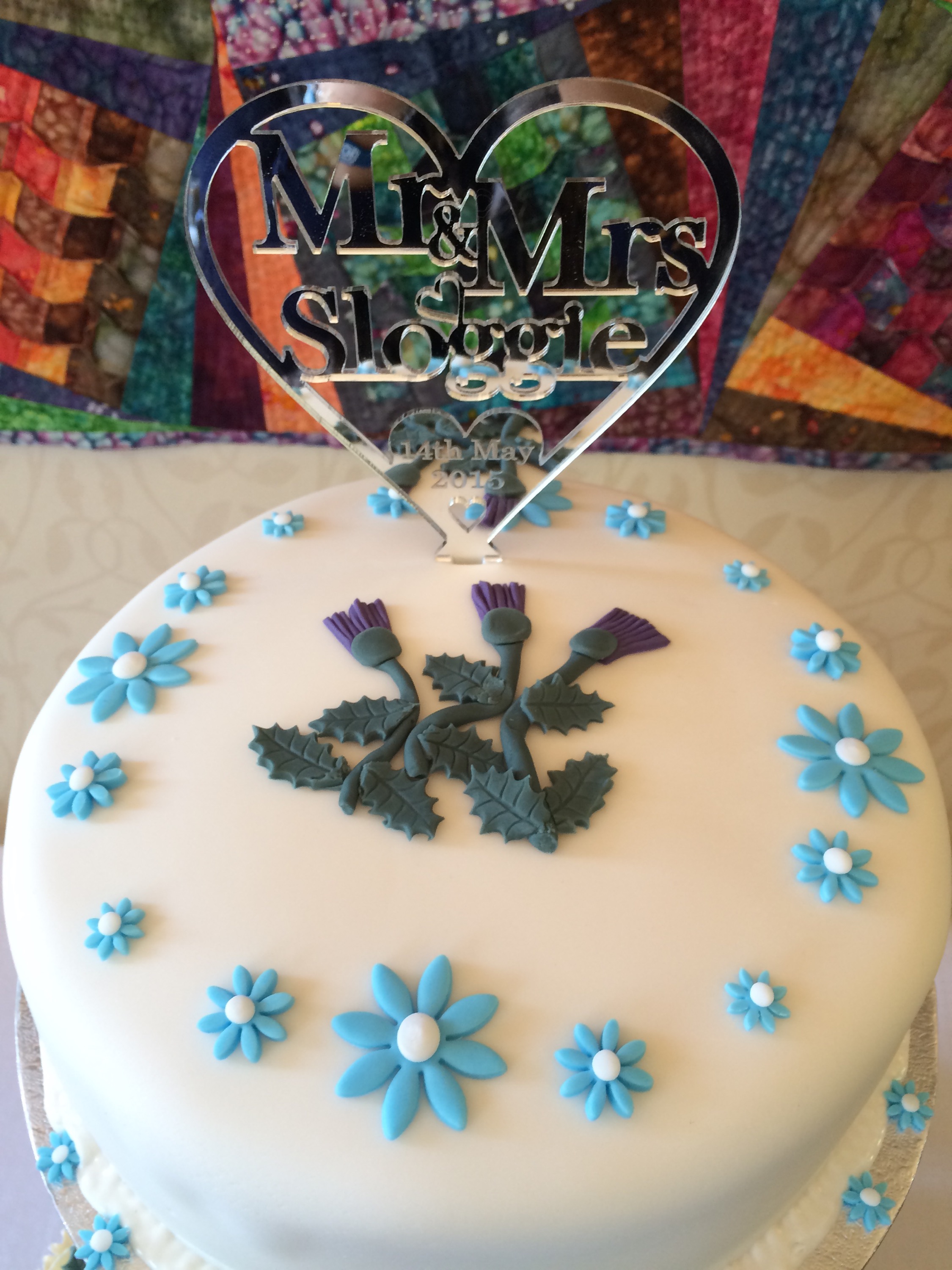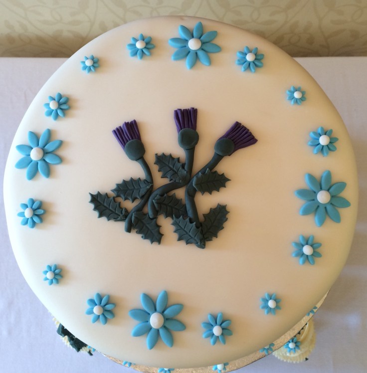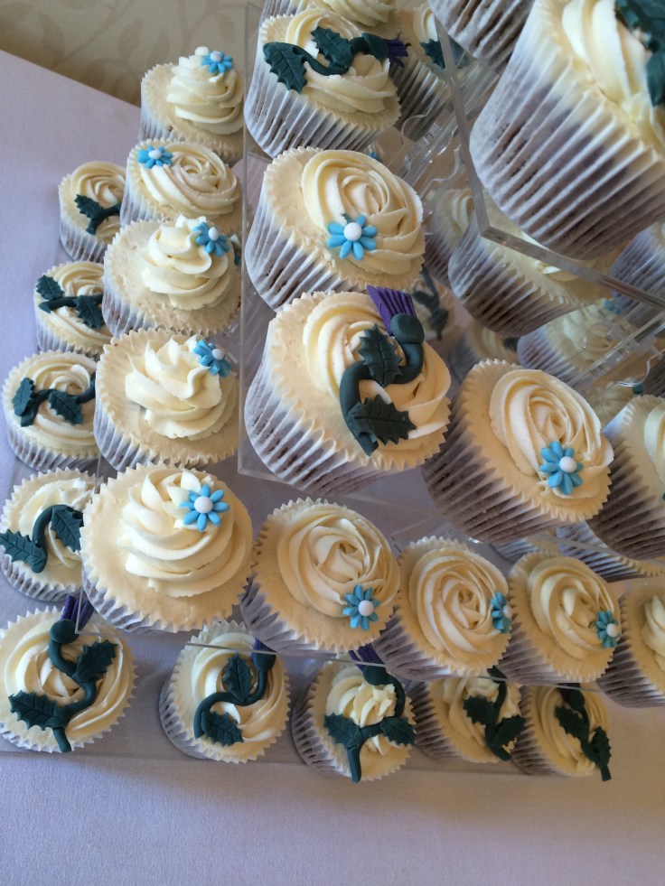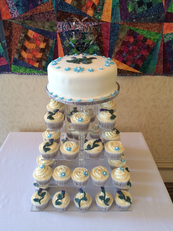 Simply classic carrot cake cupcakes and a large lemon top cake, delivered andset up at Cringletie House Hotel, nr Peebles today. Decorated with simple thistles and pale blue daisies. Happy Wedding Day to the happy couple x