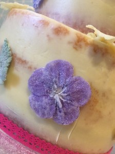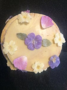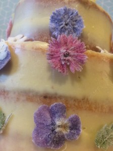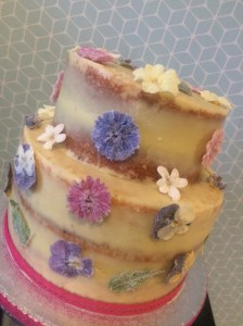 Two tier lemon drizzle sponge, with lemon curd and white chocolate ganache to fill and coat (request for no buttercream) Topped with crystallised edible flowers xx